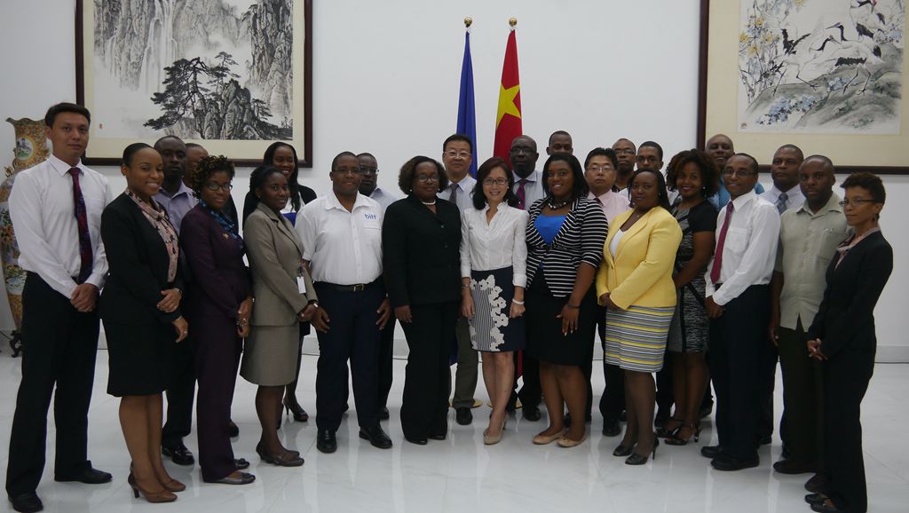 5月11日,驻巴巴多斯大使王克在使馆会见即将赴华参加金融管理研修双边培训班的巴方学员。使馆经商参赞张秀,中国人民银行驻加勒比地区银行代表卜郁,巴央行代表埃尔森·贾斯金(Elson Gaskin)及全体参训学员出席了会议。