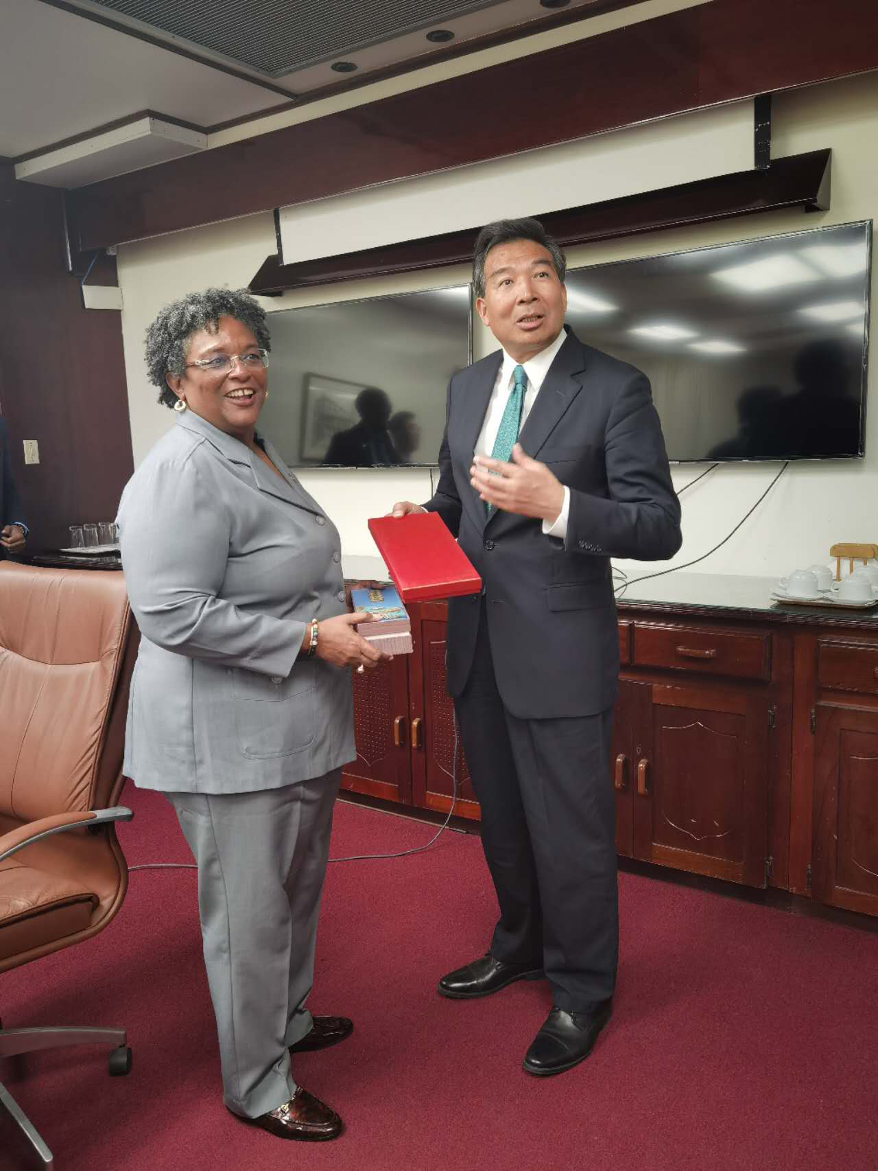 同日,罗照辉署长同巴外长西蒙兹举行会谈,就双边关系和务实合作充分交换意见并签署《中国援巴巴多斯电动公交车项目可行性研究换文》。